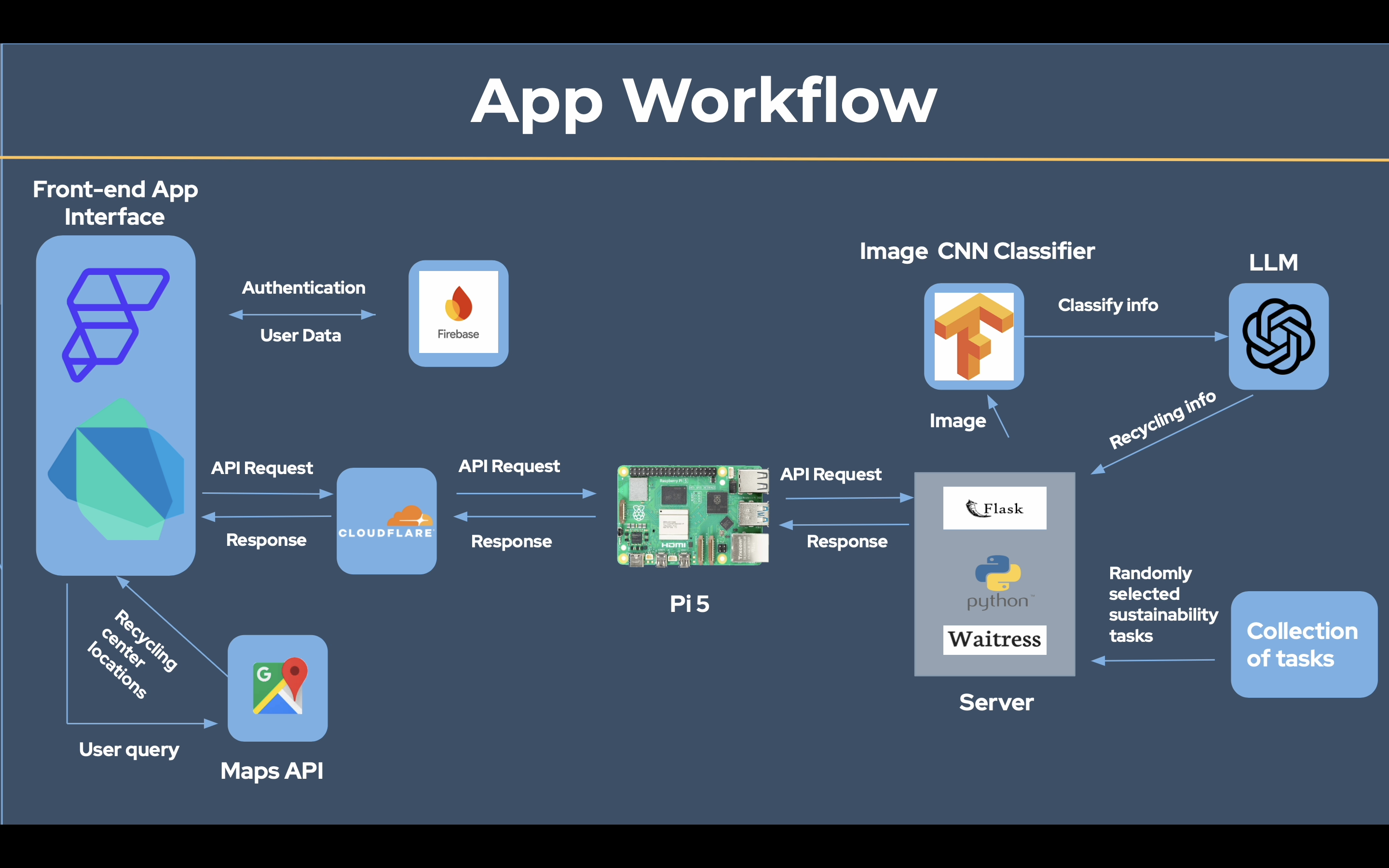 As part of the 2024 Congressional App Challenge, I developed the backend for an educational recycling app that enables users to take photos of objects and receive region-specific guidance on how to recycle them. The backend is a Python Flask server hosted with Waitress on a Raspberry Pi, exposed to the public via a Cloudflare tunnel. I implemented the image processing in two steps: first, a lightweight convolutional neural network classifies the image into one of several recyclable categories. Next, the classification, along with the user’s location data, is sent to a large language model (LLM) API, and the generated response is displayed to the user. The project ended up winning runner up in our region!